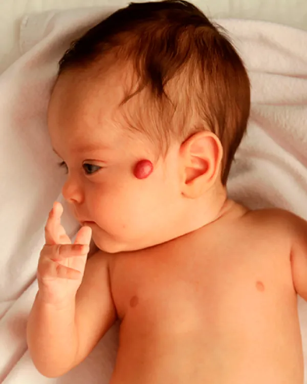 Los hemangiomas son cúmulos de vasos sanguíneos adicionales en la piel de un bebé. Pueden estar ahí cuando nace el bebé o formarse pocas semanas o meses después del nacimiento. Algunos podrían verse como manchas rojas, gomosas y abultadas «en fresa», mientras que otros se parecen a hematomas profundos. Ver que aparece un hemangioma puede ser algo preocupante para los padres nuevos.